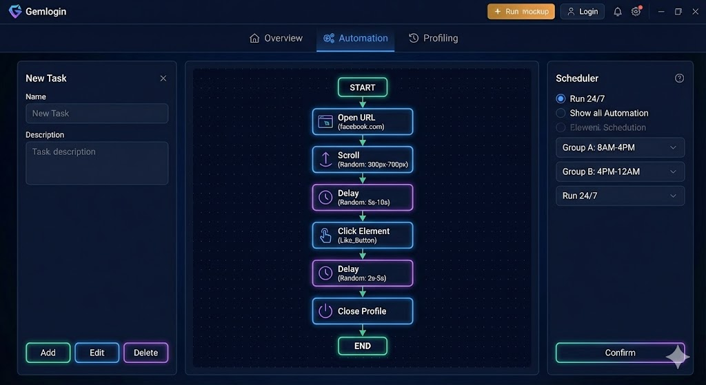 Script Gemlogin là chuỗi hành động được lập trình để Gemlogin tự động chạy trên từng profile. Bạn có thể:
