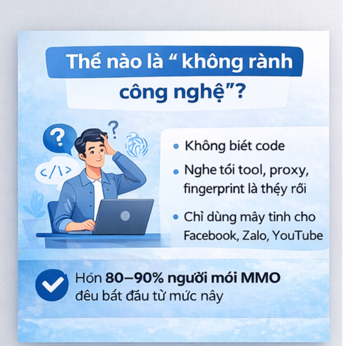 MMO ngày nay không còn là sân chơi riêng của những người giỏi công nghệ hay biết lập trình. Thực tế cho thấy, rất nhiều người bắt đầu từ con số 0, không rành máy tính nhưng vẫn tạo ra thu nhập online ổn định nhờ đi đúng hướng và sử dụng đúng công cụ. Điều quan trọng không nằm ở việc bạn biết bao nhiêu kỹ thuật, mà ở chỗ bạn hiểu rủi ro, làm đúng quy trình và tránh những sai lầm cơ bản ngay từ đầu. Nếu bạn sẵn sàng học hỏi, kiên nhẫn và chọn giải pháp phù hợp, thì việc không rành công nghệ hoàn toàn không phải là rào cản khi bước vào MMO.